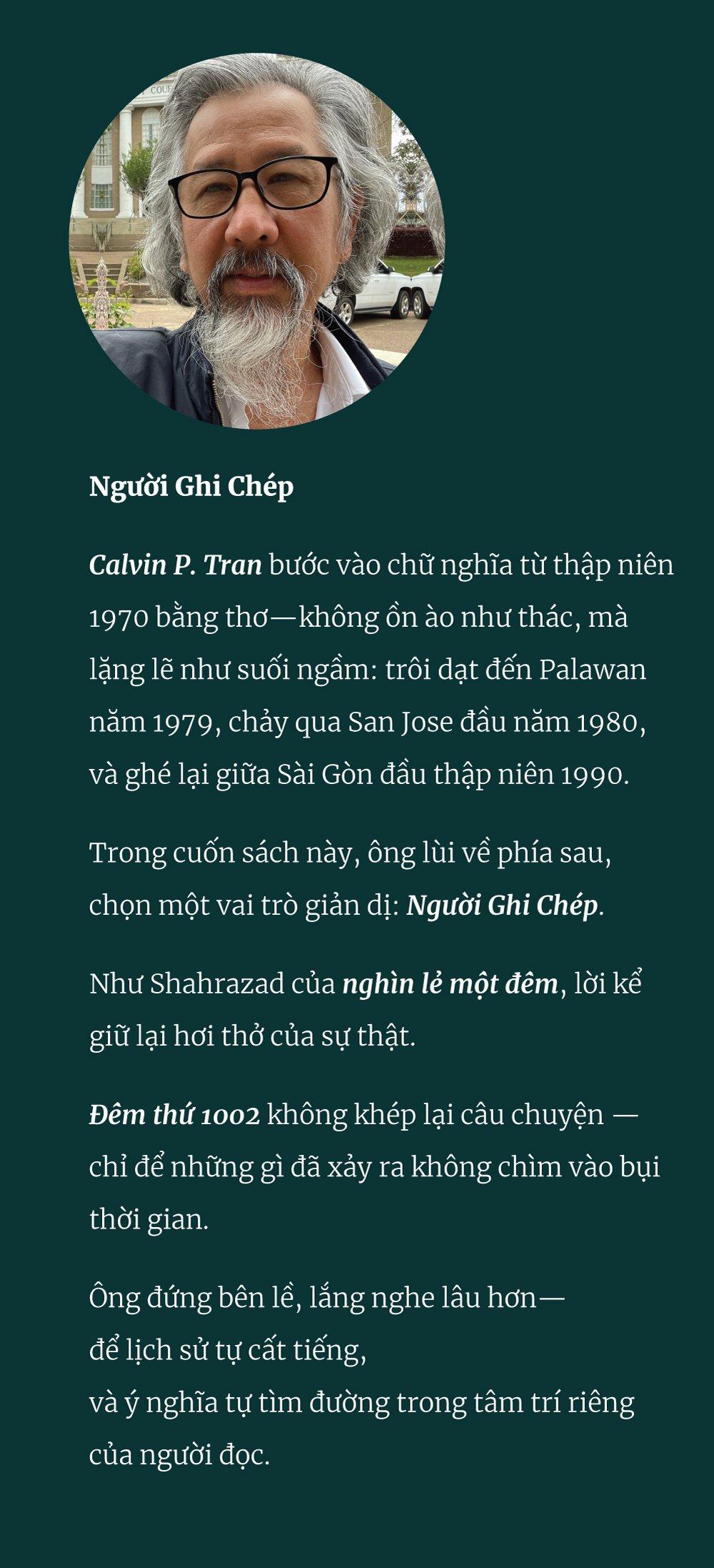 Trong cuốn sách này, Calvin P. Tran không đóng vai người phán xét. Ông lùi lại phía sau, chọn cho mình một vai trò khiêm nhường hơn: Người Ghi Chép.